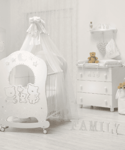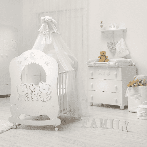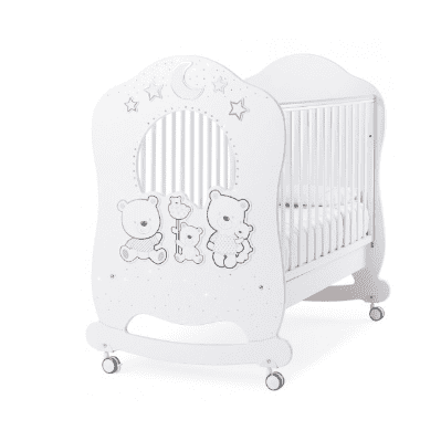 Babybett Oblo mit Details aus Swarovski Strass und mit einer niedlichen Bärenfamilie dekoriert.