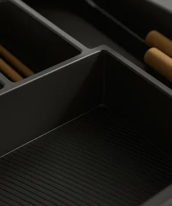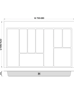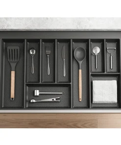 Der Besteck organizer 80 cm ist ein universeller Schubladeneinsatz für 80-cm-Unterschränke. Dank zuschneidbarer Ränder lässt er sich präzise auf 750–690 mm Breite und 490–420 mm Tiefe anpassen. Das robuste 2-mm-Material, der rutschfeste Riffelboden und die klar strukturierte Fächeraufteilung sorgen für optimale Raumnutzung und eine übersichtliche Organisation von Besteck und Küchenhelfern.