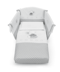 Bettgarnitur Stelle– ist dreiteilig sie besteht aus einem Kopfkissen Bezug, Stossschutz und Bettdecke (Nestchen) mit herausnehmbarer Decke.