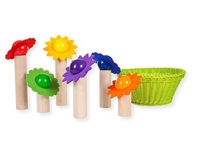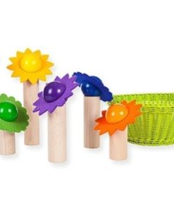 Ganz individuell oder nach Farben geordnet können Blüten zusammengesteckt und gestaltet werden. Die dicken Stäbe sind auf einer Seite nach innen gewölbt, so dass eine kugelförmige Blüte in der Wölbung Halt findet. So entstehen wunderschöne Blumen mit langem oder kurzem Stiel. Mit Geschick können die Blumen auch im Laufen balanciert werden. Z. B. mit jeweils einer Blume in beiden Händen. Die Blüten tanzen wie Kreisel auf der Tischplatte oder auf dem Fußboden, wenn sie in Schwung gebracht werden. SENSOMOTORIK – KOORDINATIONSVERMÖGEN – KONZENTRATION – GEFÜHL FÜR ÄSTHETISCHES GESTALTEN