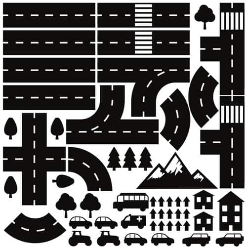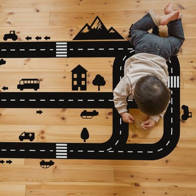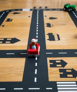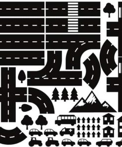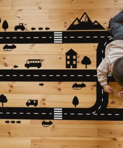 Bodenaufkleber Strasse Hergestellt aus einer speziellen Folie und einem matten Laminat, dank dessen die Oberfläche dauerhaft und unverwischbar ist. Die Spurweite beträgt nach der Verklebung laut Anleitung ca. 150×75 cm! Lässt sich auch super an Wänden und Möbeln kleben.