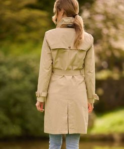 Als wahrer Klassiker begeistert der Damen Trenchcoat ‘‘Darby‘‘ mit authentischen, hochwertigen Details und erstklassigem Trage-Komfort. Dieser meisterhaft gefertigte Zweireiher präsentiert sich in femininer Schnittführung mit Wiener Nähten im Vorder-und Rückteil. Mit Umlegkragen, personalisierten Echthornknöpfen, zwei breiten, dekorativ gesteppten Leistentaschen und Gehschlitz in der hinteren Mitte. Der Mantel ist nicht nur ein optisches Highlight, sondern bietet auch viele praktische Features. Der markante Veloursledersteg in Camel lässt sich per Metallhaken und Ösen hoch arretieren. Knöpfbarer Rücken- und ein Schulterkoller vorn links sorgen für zusätzlichen Regen-und Windschutz. Die Ärmel sind mittels Riegel und Echthornschließen verstellbar und der Bindegürtel mit Fixierschlaufe sorgt dafür, dass er sicher an Ort und Stelle bleibt. Als zeitloses Statement Piece überzeugt er vor allem auch durch eine aufwändige und liebevolle Innenverarbeitung. Das Ärmelfutter im edlen Paisley Dessin kommt bei umgeschlagenen Ärmeln besonders gut zur Geltung. Ansonsten vervollständigt ein hellblaues Baumwollfutter in Jeansoptik den sportlichen Look auf stilvolle Weise. Zwei verschließbare Innentaschen bieten zudem ausreichend Platz für Ihre Essentials. Im kombifreudigen Beige beeindruckt der Trenchcoat durch zeitlose Eleganz und unterstreicht Ihre Stilsicherheit. Vielseitig kombinierbar – ist er ein ein absolutes Must-Have für jede Garderobe!