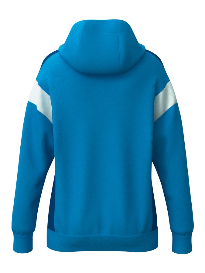 Atmungsaktive Interlock-Innenseite; Regulärer Schnitt; Überschnittene Schulter; Gefütterte Kapuze; Kinnschutz; ERIMA Wings-Druck auf den Schultern; Seitlich verdeckte Reißverschlusstaschen