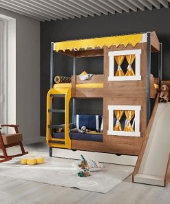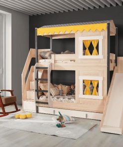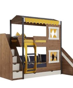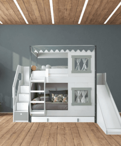 Etagenbett Castello- ist eine modere Kombination aus zwei Kinderbetten in der Grösse 190 x 90 cm ( Matratzenmass, Matratze nicht inklusive), die Fenster sind geschmückt mit Gardinen und ein schöner Baldachin ziert das Dach. Dies ist auch gleichzeitig ein schönes Spielhaus für Ihre Kinder und wird das Kinderzimmer zu einem Abenteuerspielplatz machen. Sie können in der Variante entscheiden, ob Sie eine zusätzliche Treppe haben möchten, diese bietet zudem mehr Platz für Spielzeug zum Verstauen. An dem Etagenbett Castello ist eine Leiter und eine Rutsche angebracht. Unter dem Bett haben Sie eine gräumige Schublade für Spielzeug etc.