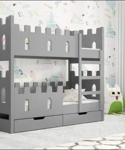Das Etagenbett Castle Gray wird mit werkseitig vorbereiteten Matratzenrahmen geliefert, was die Montage schnell und einfach macht. Zudem enthält das Set eine detaillierte Bauanleitung, die den Aufbau zu einem Kinderspiel macht. Zwei geräumige Schubladen auf Gummirollen bieten zusätzlichen Stauraum für Bettwäsche, Spielzeug oder Kleidung.