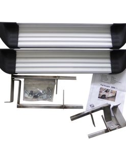 Aluminiumprofil mit verschraubter Sicherheits-Kunststoffabdeckung an den Enden und rutschhemmender Profilierung. Der Freistufensatz wird durch fahrzeugspezifische und mitgelieferte Edelstahlkonsolen am und unter dem Fahrzeugholm fest verschraubt.