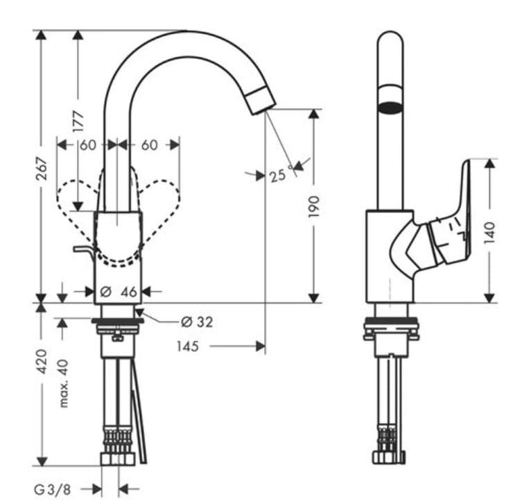 – Seitliche Griffposition: unten am Grundkörper (nicht für Waschschüsseln oder Aufsatzschalen geeignet)