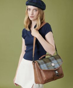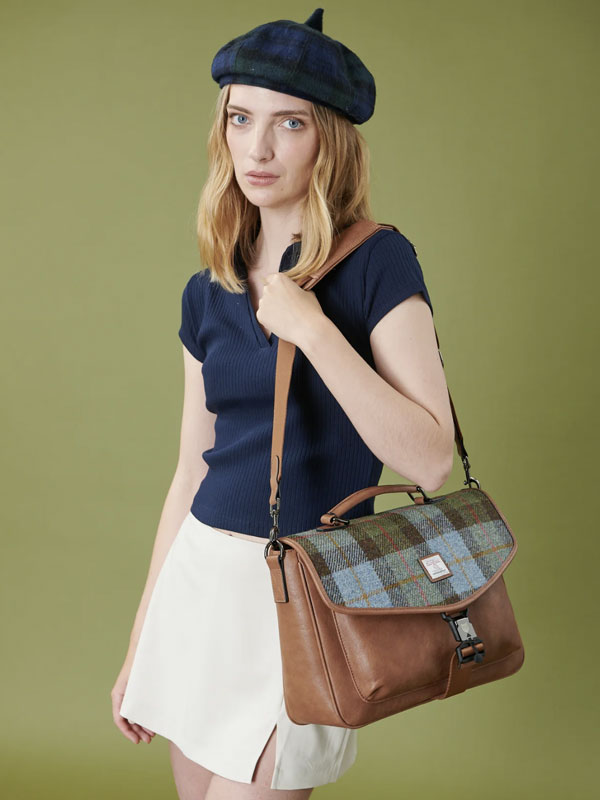 Wir präsentieren die Laptoptasche. Gefertigt aus robustem Mikrofaserleder und mit einem Deckel aus authentischem Harris Tweed, ist dieses elegante Modell ein Must-have für jede Garderobe.