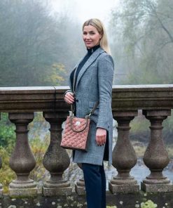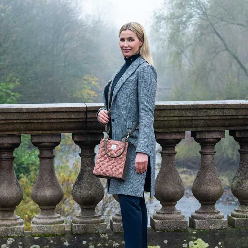 Lernen Sie unsere gesteppte Mini-Tragetasche aus Harris Tweed kennen. Diese stilvolle Tasche ist aus rautenförmig gestepptem Harris Tweed gefertigt und wird mit einem Reißverschluss geschlossen.
