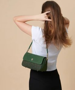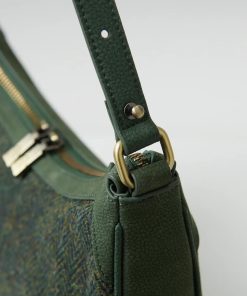Harris Tweed Schultertasche, Modell Ellon, Islander, Dunkelgrünes Fischgrätmuster.