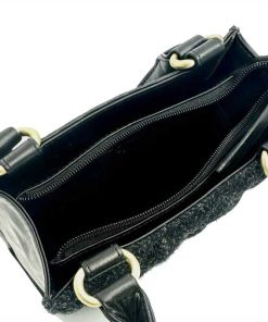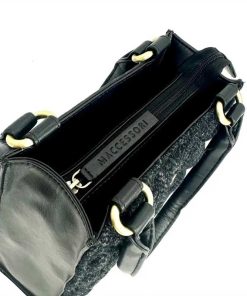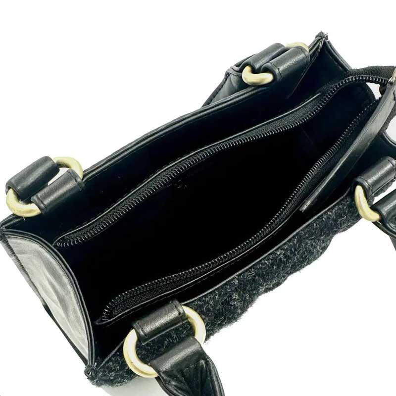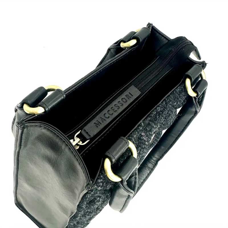 Die Harris-Tweed-Tasche verfügt über eine Reißverschlusstasche auf der Rückseite, ein offenes Fach und eine Innentasche mit Reißverschluss.