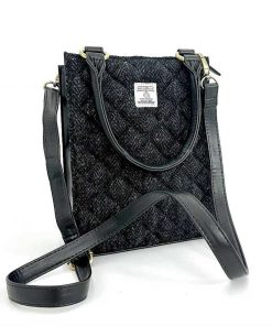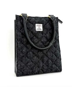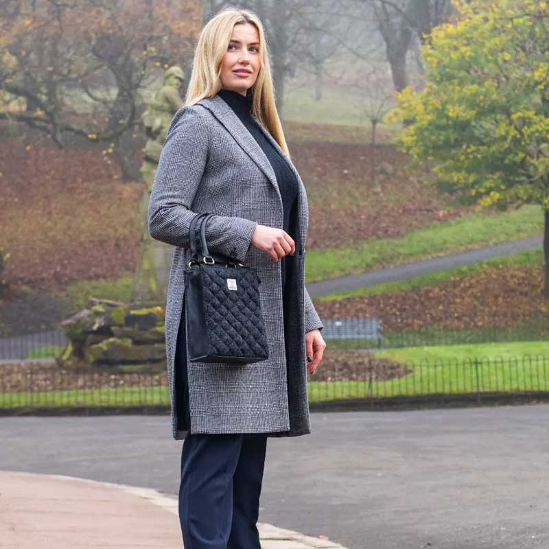 Lernen Sie unsere gesteppte Mini-Tragetasche aus Harris Tweed kennen. Diese stilvolle Tasche ist aus rautenförmig gestepptem Harris Tweed gefertigt und wird mit einem Reißverschluss geschlossen.