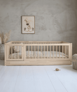 Das Bett ist aus laminiertem Kiefernholz gefertigt. Glatt geschliffen, mit abgerundeten Formen.