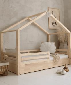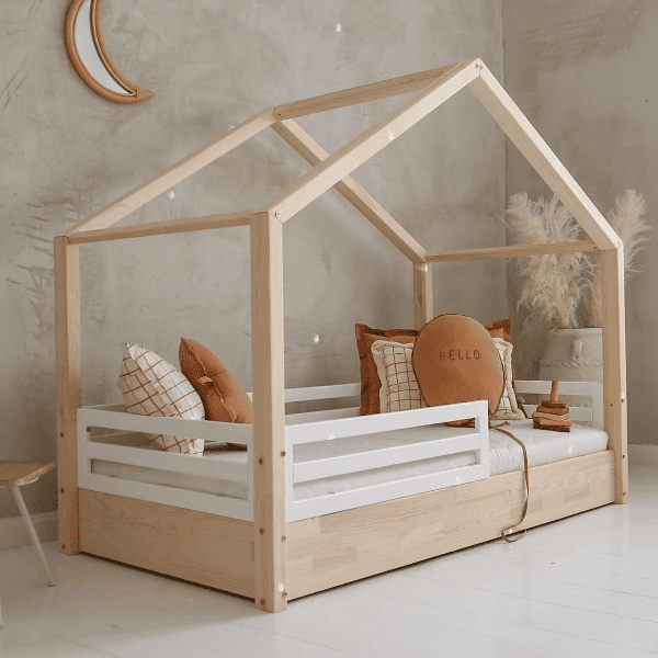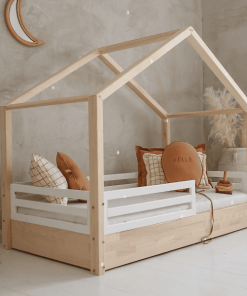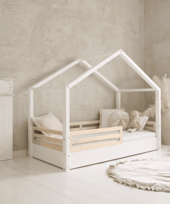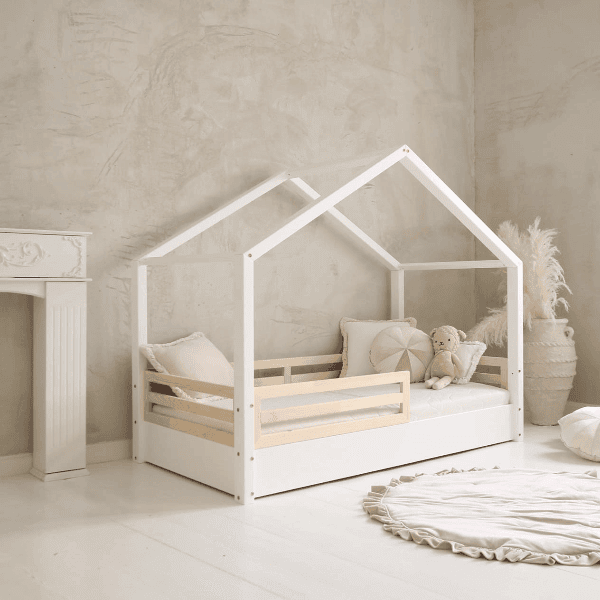 Das Hausbett verfügt über ein 1/3-langes Geländer, sodass das Geländer insgesamt 2/3 der Bettlänge ausmacht.