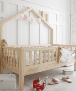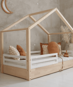 Das Hausbett Sugar ist ein klassisches Bett mit Schienen im skandinavischen Stil. Das Modell eines klassischen Bettes wurde mit einem Mini-Haus an der Wand angereichert.
