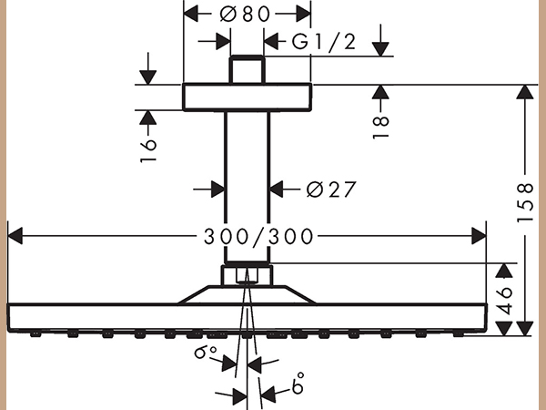 – Besteht aus: Kopfbrause, Deckenanschluss – Brausekopfgröße: 300 x 300 mm – Strahlart: RainAir – Kugelgelenk: Kopfbrause im Winkel verstellbar – maximale Durchflussmenge bei 3 bar: 17 l/min – Durchflussmenge RainAir Strahl (bei 3 bar): 17 l/min – Mindest