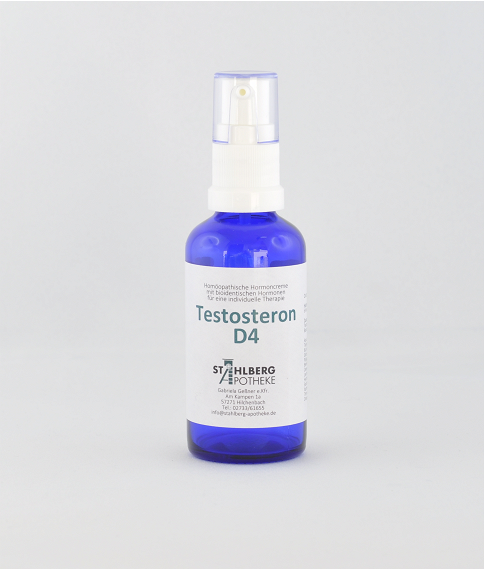 Die verschreibungsfreie Testosteron D4 Creme enthält das bioidentische Hormon Testosteron in der homöopathischen Potenz D4. Die Potenzierung erfolgt von Hand und das bioidentische Hormon wird vor der Verarbeitung auf Identität und Reinheit geprüft. Das Hormon wird aus dem natürlichen Wirkstoff Diosgenin – gewonnen aus der Yamswurzel oder dem gelben Ingwer – hergestellt.