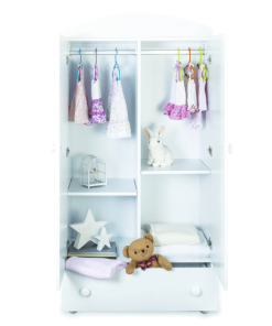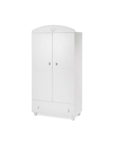 Kinderschrank Sweet Star, weiss mit 2 Türen und einer geräumigen Schublade. Im Innern ist der Schrank mit einer zentralen Trennwand, 2 Schrankböden und 2 Kleiderstangen ausgestattet. Auf Anfrage sind eventuelle zusätzliche Schrankböden erhältlich. Die Türgriffe sind im weiss.