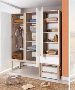Das Kinderzimmer Palermo vereint Eleganz und Schlichtheit in einem zeitlosen skandinavischen Design. Mit natürlichen Holzmustern und der dominanten Verwendung von Weiß bringt es die Wärme des traditionellen Stils in jeden Raum. Die hohe Belastbarkeit der verwendeten Materialien sorgt für Langlebigkeit und Stabilität, sodass das Kinderzimmer auch den täglichen Herausforderungen standhält. Das Kinderzimmer Palermo bietet nicht nur ein modernes und gemütliches Ambiente, sondern schafft durch seine geräumige Gestaltung auch viel Platz für Kreativität und Entfaltung. Verarbeitet mit 18-mm-MDF der Güteklasse E1, gewährleistet er höchste Qualität und Umweltfreundlichkeit.