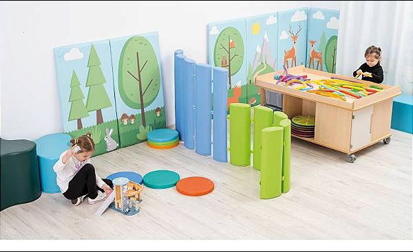 Die niedrigen, gepolsterten Trennwände fördern die Selbstständigkeit der Kinder und schaffen gleichzeitig sichere Spielzonen, in denen sie sich frei bewegen und entdecken können. Pädagogische Fachkräfte behalten dabei stets den Überblick – ohne auf Geborgenheit und Struktur im Raum verzichten zu müssen.