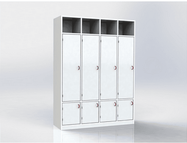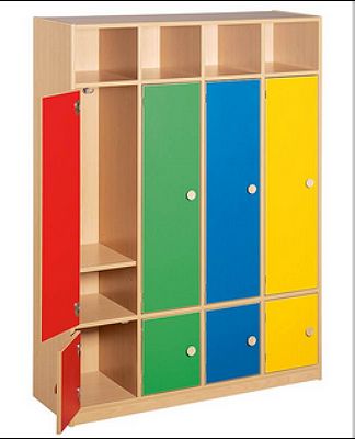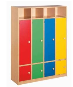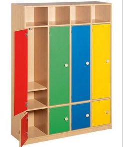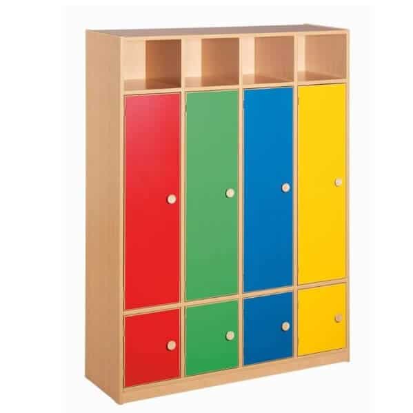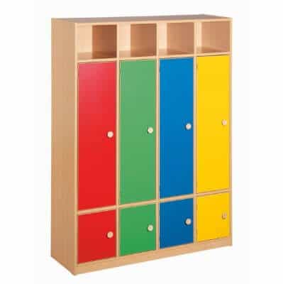 Die farbigen Türen (z. B. in Rot, Gelb, Grün, Blau – je nach Variante) schaffen eine freundliche Atmosphäre und helfen Kindern dabei, ihre eigenen Fächer leichter zu erkennen.