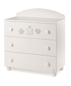 Kommode Prinz Farbe weiss mit einer breiten Auflagefläche, ideal für eine praktische und elegante Wickelauflage aus Textil oder Pvc. Ausgestattet mit 3 bequemen und geräumigen Schubladen mit abgerundeten Griffen in weiss, wie die Ausführung des Möbelstücks.