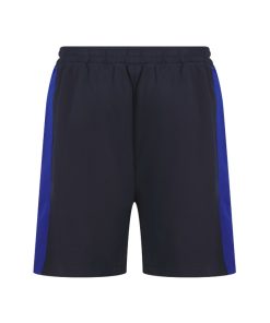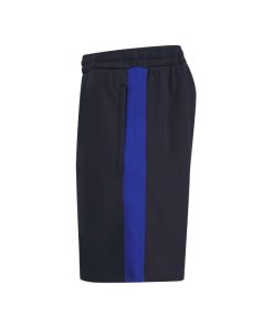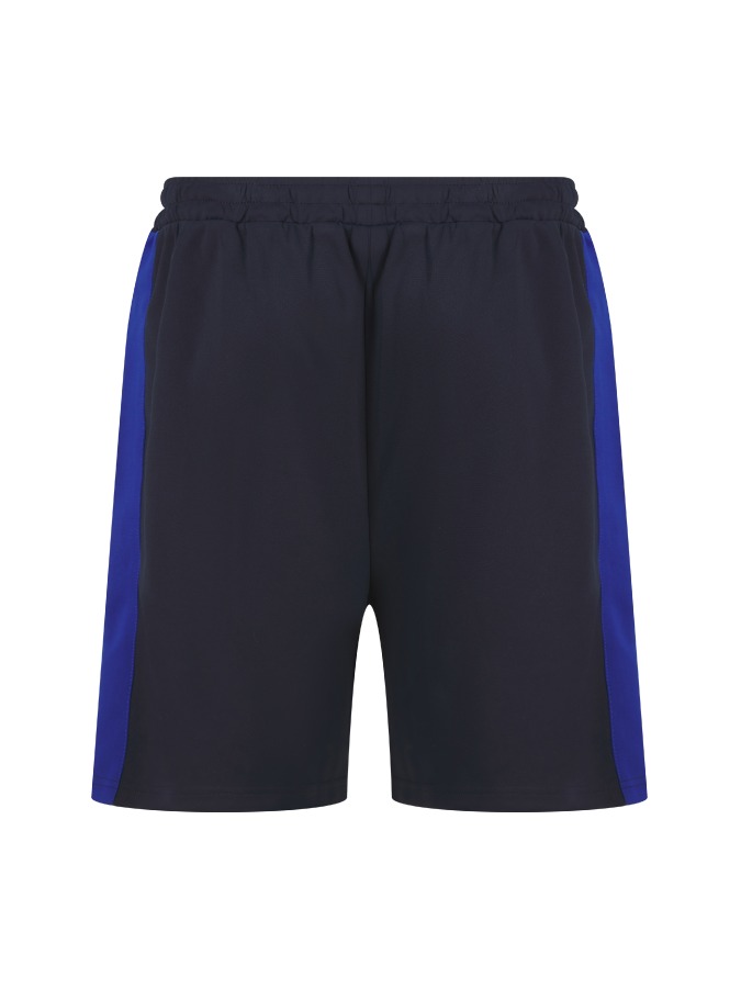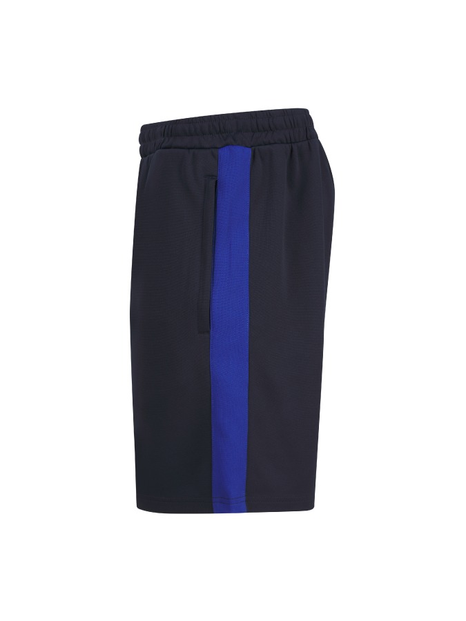 Schnitt: Shorts mit elastischem Bund und innenliegendem Kordelzug. Seitenteile in Kontrastfarbe. Seitennahttaschen mit Reißverschluss. Doppelnähte am Saum.
