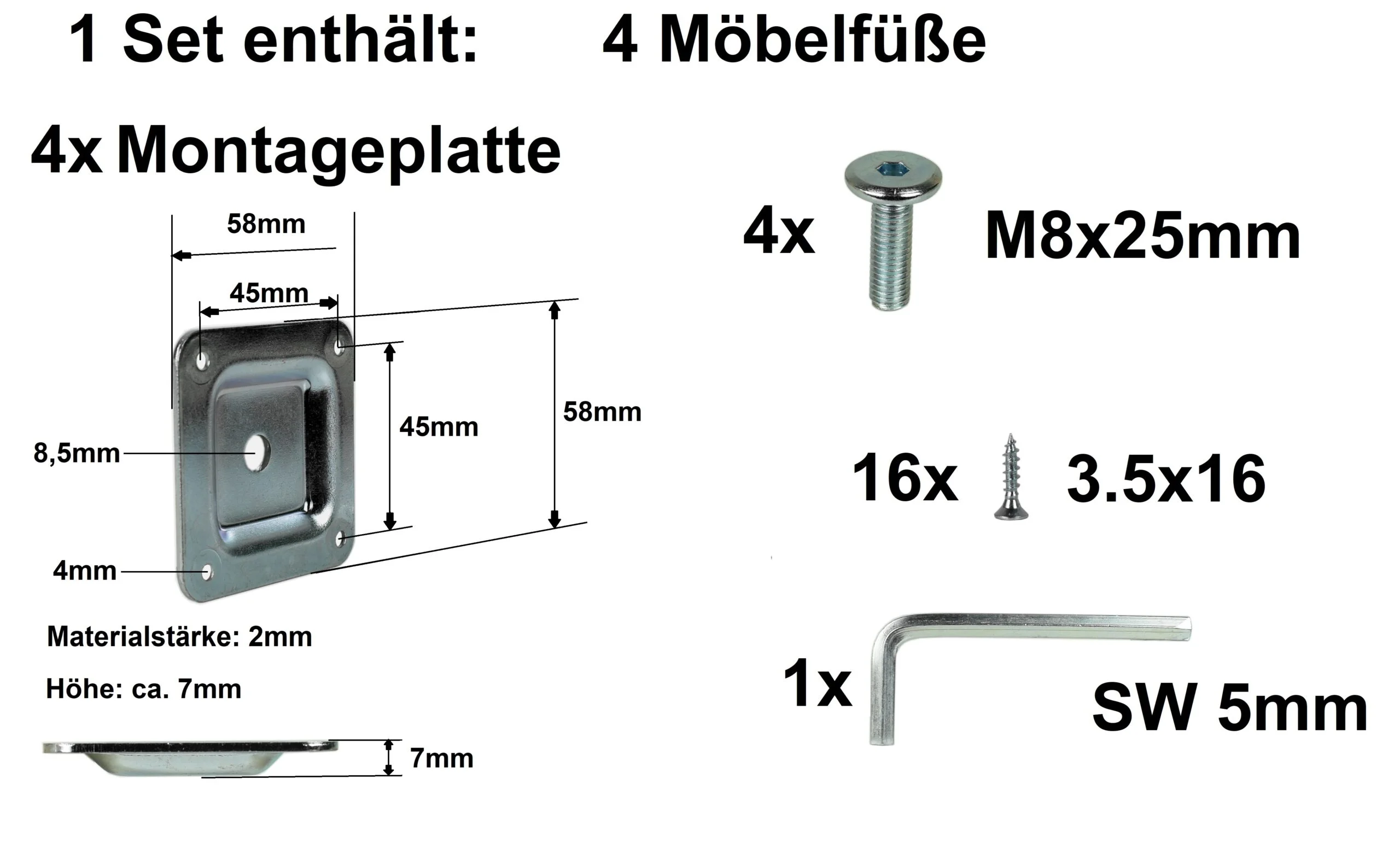 - M8 Montage: Platte 58 × 58 × 2 mm · Schrauben + Inbus inkl.