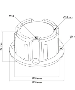 Die kompakte Aufnahme (60×27 mm) wird direkt auf den Möbelboden verschraubt und ermöglicht eine sichere, wiederlösbare Fußmontage ohne Bohrung im Möbelbein.