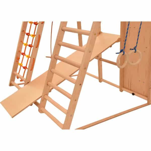 - Vielseitiges Design: Integrierte Kletterelemente wie Leitern, Sprossenwände und Kletternetze bieten abwechslungsreichen Spielspaß.