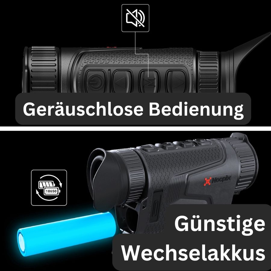 Hersteller-Lieferumfang: Nocpix Wärmebild-Handgerät, 2x 18650 Akkus, Ladegerät, Datenkabel, Tragegurt, Objektiv-Reinigungstuch, Schnellstartanleitung, Deutsche Bedienungsanleitung (gedruckt) 3 Jahre Herstellergarantie