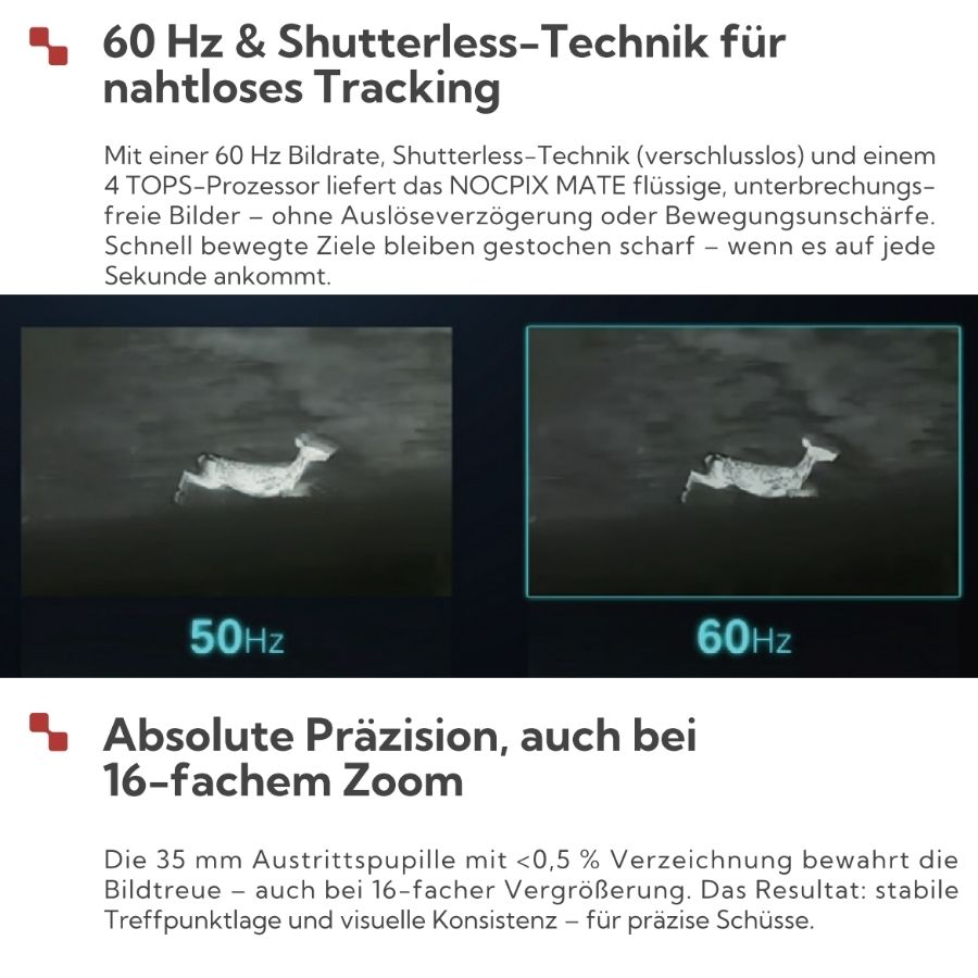 Das NocPix Mate Lite L38 ist ein kompaktes Wärmebild Vorsatzgerät für den jagdlichen Einsatz. Mit seinem 384 × 288 Hochleistungssensor und einer Empfindlichkeit von ≤ 15 mK zeigt es feinste Wärmedetails, selbst bei Nebel, Regen oder schwierigen Lichtverhältnissen. Das 38 mm Objektiv bietet eine sehr gute Balance zwischen Reichweite und Übersicht, während die 1950 m Detektionsreichweite genügend Reserven für die Feldjagd gibt. Dank AMOLED Display in Full-HD und 60 Hz Bildrate liefert das Gerät klare, flüssige Bilder ohne Verschlussunterbrechung. Mit nur 457 g Gewicht und einem stabilen Magnesiumgehäuse ist das Gerät besonders führig und robust. Die 18650 Wechselakkus ermöglichen bis zu 6 Stunden Laufzeit und können im Feld schnell getauscht werden. Damit ist das Mate L38 die richtige Wahl für Jäger, die ein zuverlässiges, leichtes und praxisnahes Vorsatzgerät suchen.