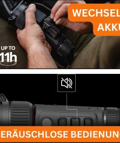 Das Nocpix VISTA H50R ist für den praktischen Einsatz konzipiert. Mit einer Akkulaufzeit von bis zu 5 Stunden und einem leicht austauschbaren IBP-7 Akku bietet es langanhaltende Leistung im Revier. Das kompakte Design mit einem Gewicht von nur 650 g inklusive Akku sorgt für einfachen Transport, während der geräuschlose Objektivdeckel und der Dioptrienausgleich eine angenehme Handhabung ermöglichen.
