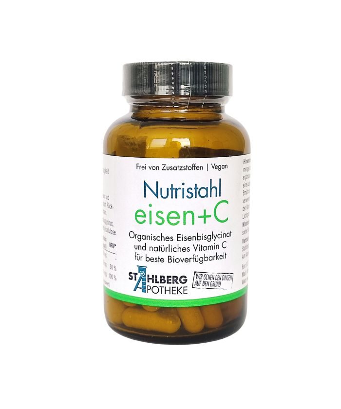 Doch bei der Einnahme von oralen Eisenpräparaten leiden Betroffenen häufig an Magenbeschwerden. Unser Eigenprodukt Nutristahl eisen +C enthält die Verbindung Eisenbisglycinat , welches zu einer besseren Aufnahme ohne diese Begleiterscheinungen führt. Mit dem natürlichen Vitamin C aus der Acerola-Kirsche wird die Verfügbarkeit und Aufnahme im Körper nochmals optimiert.