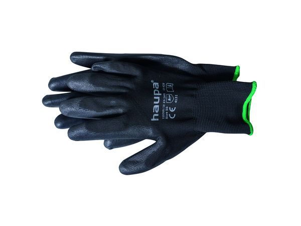 PU-Textil-Handschuh PU-Arbeitshandschuh zum Schutz vor mechanischen Risiken gemäß EN420 Kat. 2, EN388 Level 4.1.3.1.; schwarz / schwarz, Handinnenfläche und Fingerkuppen mit PU Beschichtung, Polyamid-Liner, Rundstrick – nahtlos, Strickbund, angenehmer Tragekomfort, atmungsaktiv, sicherer Griff mit exzellentem Tastgefühl, hohe Abriebfestigkeit für lange Standzeiten, hervorragende Passform, paarweiseBei Fragen zum Produkt bitte Email an [email protected] EAN 4011923602260 Herstellernummer120300/9