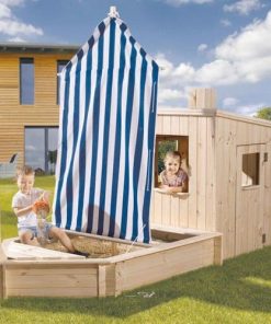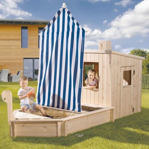 Das Sandkastenschiff mit toller Kajüte sorgt für viel Spaß und Abwechslung. Das WEKA Sandkastenschiff ist alles andere als bloß ein Sandkasten. In dem Bausatz sind Mast, ein integriertes Sitzbrett, eine Kajüte und Segel inklusive und bietet allen reiselustigen Abenteurern pures Vergnügen. Das Sandkastenschiff wurde aus massivem, unbehandeltem Kiefernholz gefertigt und durch die 18 mm starken Wände kann auch ein Sturm auf hoher See dem Schiff nichts ausmachen. Mit diesem Sandkastenschiff wird Ihr Kind zu einem kleinem Pirat und der Fantasie sind keine Grenzen gesetzt. Das Sandkastenschiff ist ein Produkt der Firma WEKA Holzbau GmbH aus Deutschland. WEKA steht für Qualität!