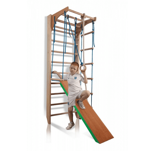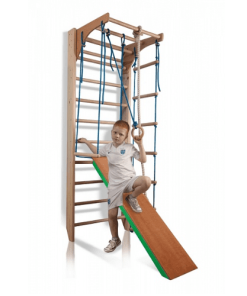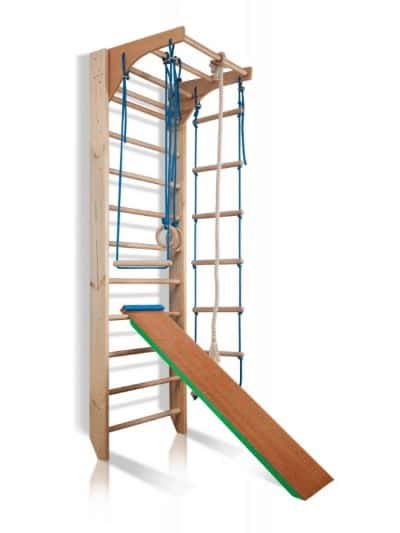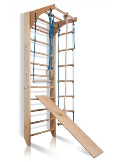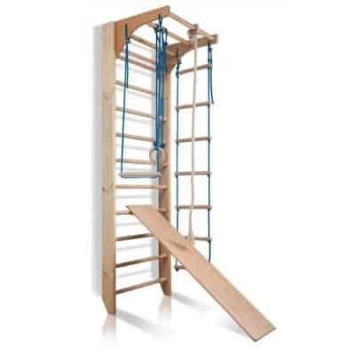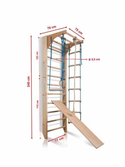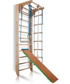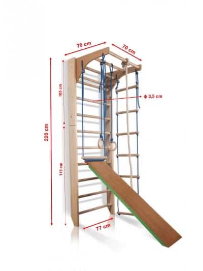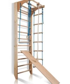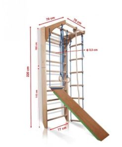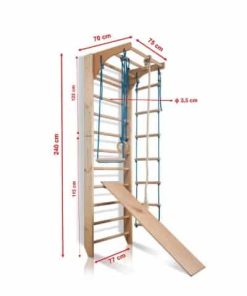 Sprossenwand Kombi 3 das Produkt wird aus hochwertigem Buchenholz hergestellt, die vertikalen Führungen sind aus Kiefernholz. Das Holz ist lackiert und poliert. Es ist für Kinder ab 2 Jahre geeignet, kann aber auch von Erwachsenen benutzt werden.