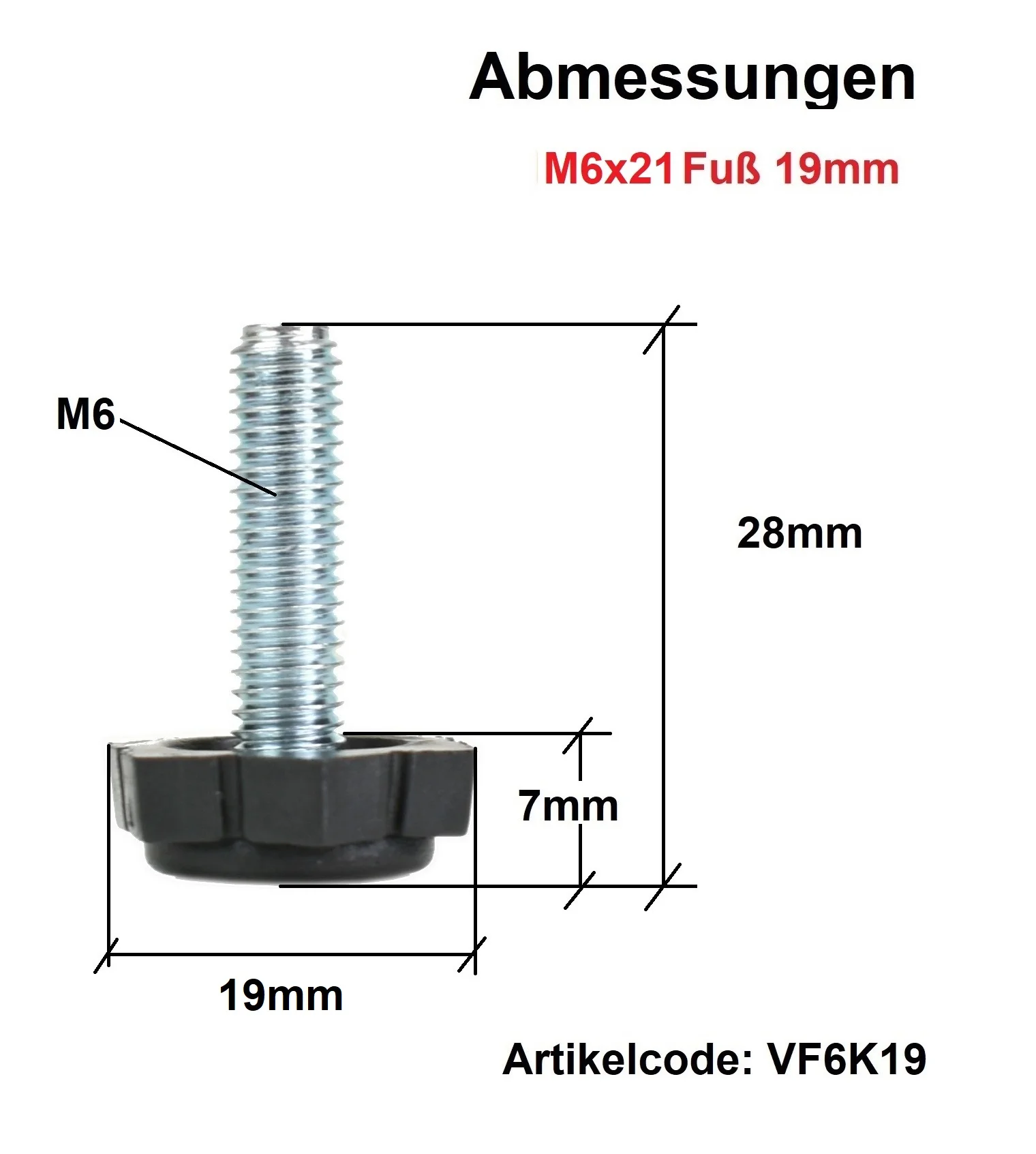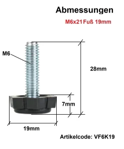 Das M6-Gewinde mit 21 mm Länge sorgt für sicheren Halt, während der Ø19 mm Kunststofffuß