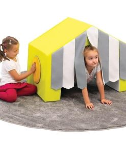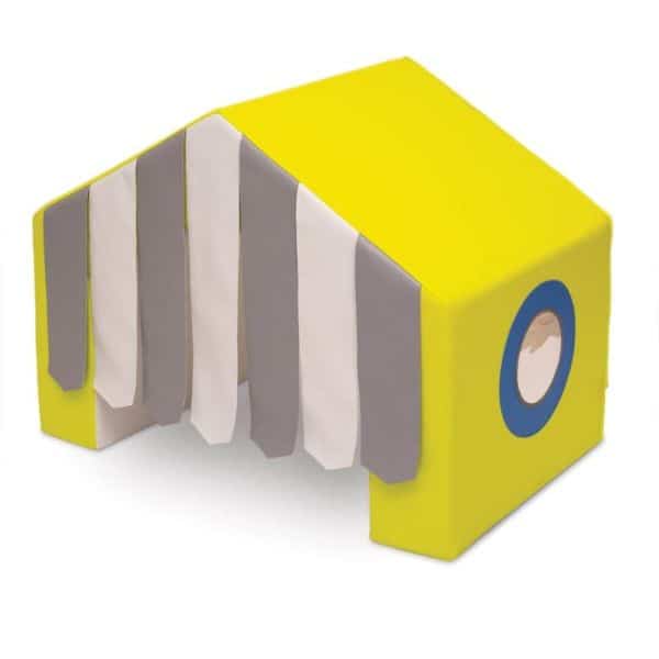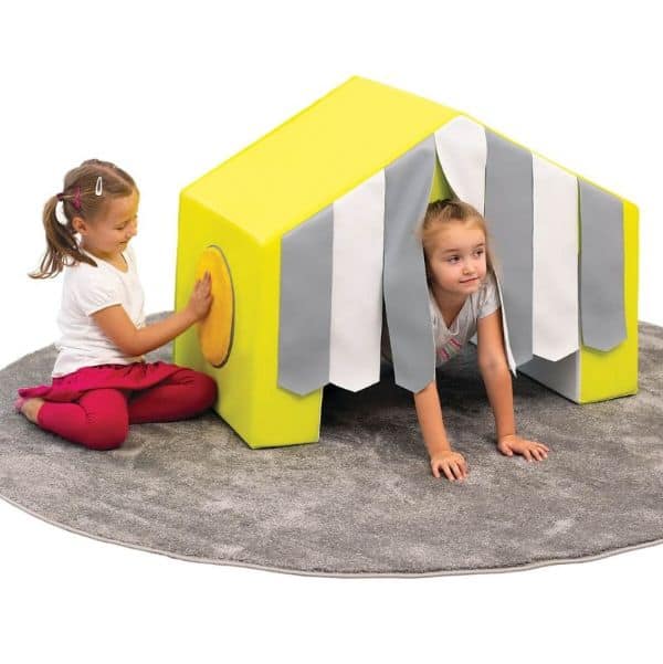 - 1 x Spielhaus mit Vorhang (92 x 60 x 74 cm, Spiegel Ø18 cm, Velourskreis Ø 27 cm, Materialien: grüner, weißer und grauer Kunstleder, gelber Samt)
