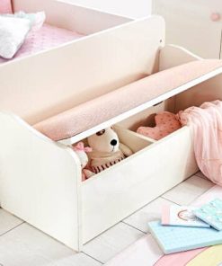 Die Truhenbank Einhorn ist ein dekoratives und funktionales Produkt mit Sitzpuff und Stauraum. Mit seinem Raum mit zwei Fächern im Inneren bietet es die Möglichkeit, die Artikel in Kategorien aufzubewahren.