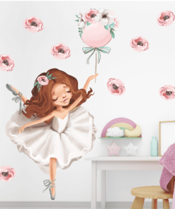 Wandsticker Ballerina mit einem von Pastellblumen umgebenen Ballon ist eine Dekoration, die das Zimmer Ihres Kindes hervorhebt. Der modischste Aquarellstil.