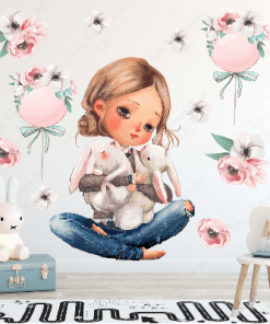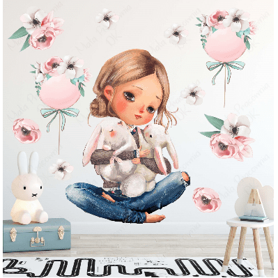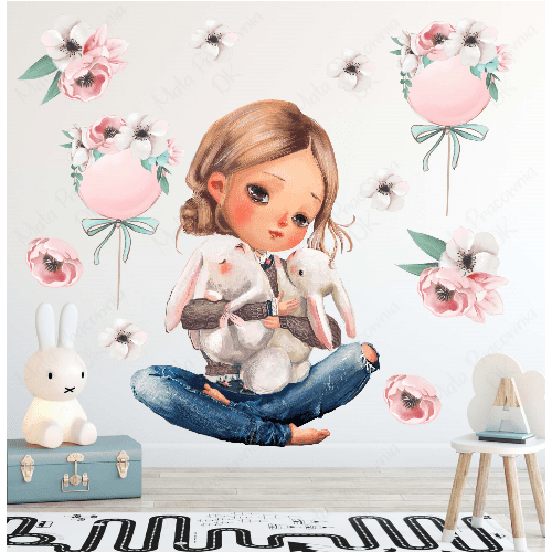 Wandsticker Girl mit Hasen, umgeben von Pastellblumen mit fliegenden Luftballons, ist eine Dekoration, die das Zimmer Ihres Kindes hervorhebt. Der modischste Aquarellstil.