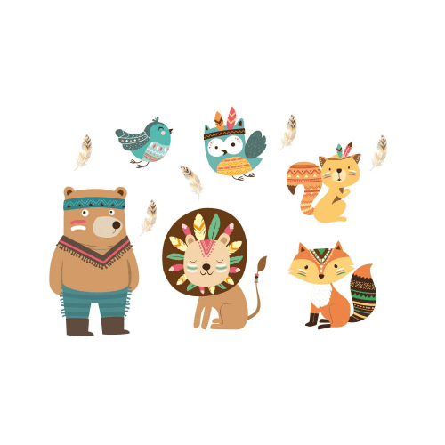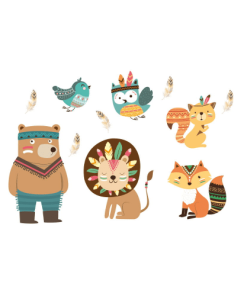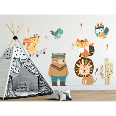 Wandsticker Indian Indischer Teddybär, Eule, Löwe, Fuchs und Vögel, die besten Waldapachen sind eine Dekoration, die das Zimmer Ihres Kindes hervorhebt. Aufkleber auf den Umriss geschnitten, kein Hintergrund.