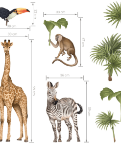 Das Wandsticker Serengeti Set enthält: Giraffe, Tukan, Affe, Zebra, große Palme, mittlere Palme, kleine Palme, Blatt. Die genauen Maße sind auf dem letzten Foto angegeben.