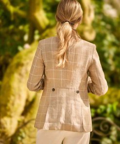 Edler Leinenblazer ”Carola” aus 100% Leinen präsentiert sich sommerlich im dezenten Fensterkaro und begeistert mit erstklassigem Trage-Komfort. Reines Leinen hat den authentischen Knitter-Effekt – ein Echtheits-Merkmal dieser wunderbaren, natürlichen Qualität. Die schlanke und leicht taillierte Blazer-Variante gibt sich klassisch und elegant zugleich mit einer besonderen Note Heritage. Erstklassig verarbeitet in ausgezeichneter Passform als drei- Knopf Blazer mit Knöpfen in Hornoptik, zwei Pattentaschen, eine Brustleistentasche, eine Billettasche sowie einer Innentasche. Liebevolle Detaillösungen zeigen sich im mit hellem Wollfilz unterlegtem Kragen, sowie den zwei Seitenschlitzen und Knöpfen im Rückteil, die den Look stilvoll abrunden. Als zeitloser Klassiker ergänzt dieser Blazer viele Outfit-Ideen zu anspruchsvollen Looks.