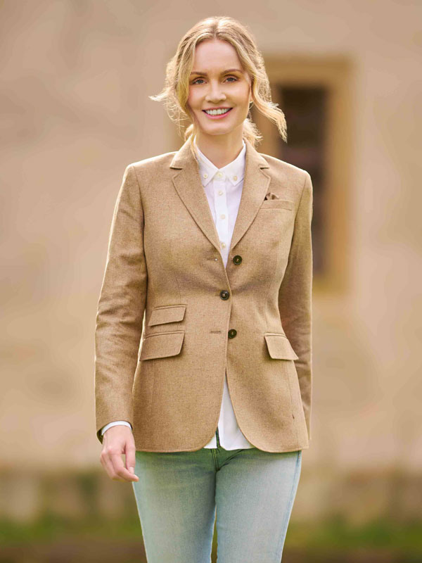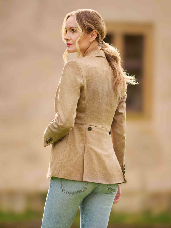 Wunderschöner sommerlicher Damenblazer “Carola“ aus edelster Seide. exklusive, leichte Tuch mit dezentem Glanz in kombifreundlichen Farben wirkt klimatisierend, temperaturausgleichend und erfüllt allerhöchste Ansprüche. Die schlanke und leicht taillierte Silhouette gibt sich klassisch und elegant zugleich mit einer besonderen Note Heritage. Erstklassig verarbeitet in ausgezeichneter Passform als drei- Knopf Blazer mit Knöpfen in Hornoptik, zwei Pattentaschen, eine Brustleistentasche, eine Billettasche sowie eine Innentasche. Liebevolle Detaillösungen zeigen sich im mit Wollfilz unterlegtem Kragen, sowie den zwei Seitenschlitzen und Knöpfen im Rückteil die den edlen Look stilvoll abrunden und viele Outfit Ideen anspruchsvoll ergänzen.