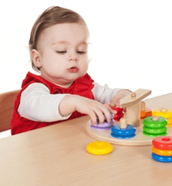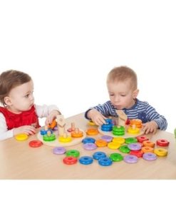 Jedes Kind bekommt ein eigenes Zeiger-Steckspiel. Die Scheiben zum Aufstecken sind im Körbchen. Das Kind kann selbst den Zeiger anschubsen und drehen lassen, bis der Zeiger stehen bleibt und auf eine Farbe zeigt. Wenn der Zeiger z. B. auf rot zeigt, sucht das Kind eine rote Scheibe und steckt sie auf den Stecker. Und so weiter. Jeweils zwei Scheiben passen auf einen Stecker. Geeignet für die Kinderkrippe. Für 1 – 4 Kinder. Für ganz kleine Hände.